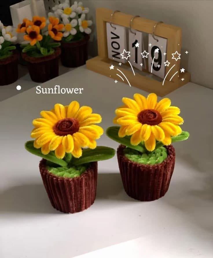 Customization: Available in bright yellow or sunset orange petals with your choice of dark chocolate or tan pots.
