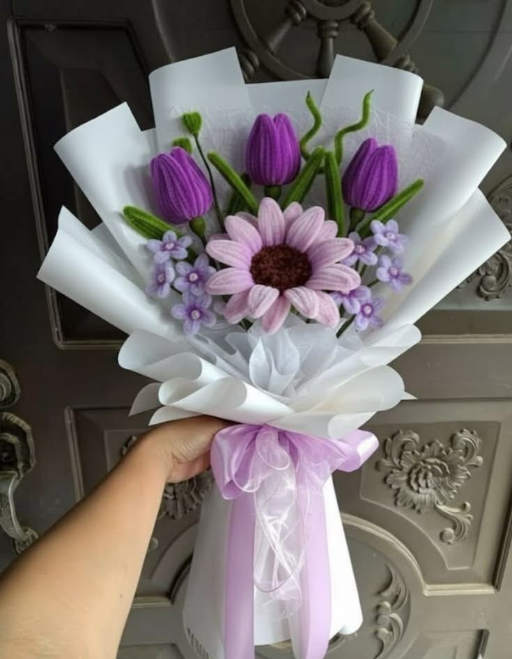 A handcrafted forever bouquet featuring soft chenille-stem (pipe cleaner) flowers arranged in crisp white wrapping with sheer tissue accents and finished with a lilac satin-organza bow. The arrangement centers on a plush lavender daisy with a textured brown core, framed by three vibrant purple tulips and delicate clusters of tiny lilac forget-me-nots, all set on bendable green stems. Lightweight, everlasting, and allergy-friendly—perfect for birthdays, anniversaries, graduations, or as a keepsake gift that won’t wilt.